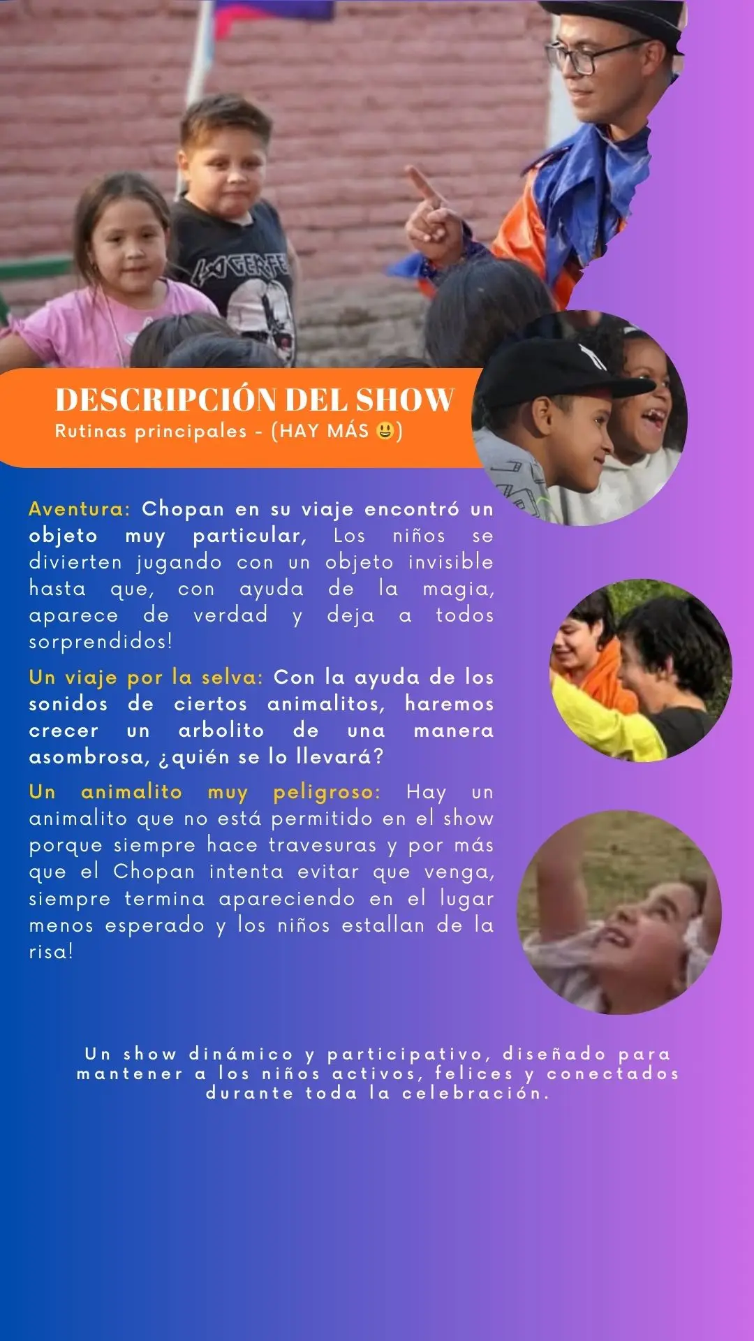 Show completo de 2 horas con juegos, aventuras, magia participativa, animación y experiencia inolvidable para cumpleaños infantiles. Parlante y micrófono profesional, ¿Quieres saber más?